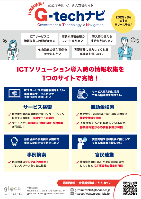 官公庁専用ICT導入支援サイト G-techナビG-techナビは、省庁・自治体などの官公庁様専用のICT導入支援サイトです。近年自治体様には「自らが担う行政サービスについて、デジタル技術やデータを活用して、住民の利便性を向上させるとともに...